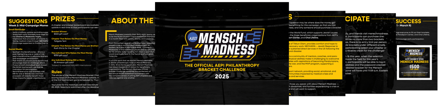 Mensch Madness is AEPi’s annual bracket challenge, where participants compete for a cash prize while raising money for a featured charity — and in 2025, I gave the campaign a full visual overhaul. I created a clean, sporty, and modern brand identity unique to Mensch Madness, complete with chapter-ready social graphics, national promotional content, and a comprehensive campaign guide. The guide, which explained the event and outlined how chapters could get involved, was designed start to finish in just one week — during a week I was scheduled to move across states and had requested PTO months earlier (I was told it was fine, and then had to work anyway). Despite the chaos, I delivered a high-impact, cohesive campaign that raised the visual standard for years to come.