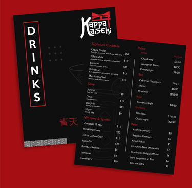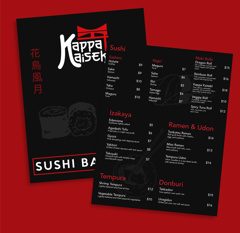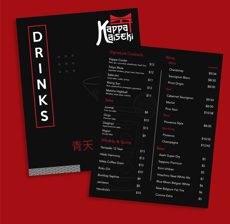 Kappa Kaiseki is a high-end Japanese restaurant concept I created for a college branding assignment, blending traditional culture with modern elegance. The name combines Kappa, a nod to Japanese folklore, with Kaiseki, a refined multi-course dining experience known for its seasonal precision and presentation. I developed the full identity system from scratch — including logos, typography, color palette, and real-world applications like sleek, minimal food and drink menus. The visual direction leans dark, bold, and luxurious, using black and red to emphasize sophistication. Designed entirely in Adobe Creative Suite, this project is one of my favorite executions — conceptually strong, visually tight, and exactly the vibe I was aiming for.